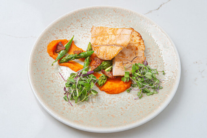 Slice and brown fully cooked turkey breast and pair with smooth carrot puree, fresh roasted asparagus and a sprinkle of microgreens.