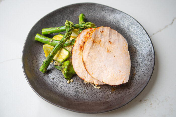 Pan-Seared Turkey Breast with Carrot Puree and Roasted Asparagus