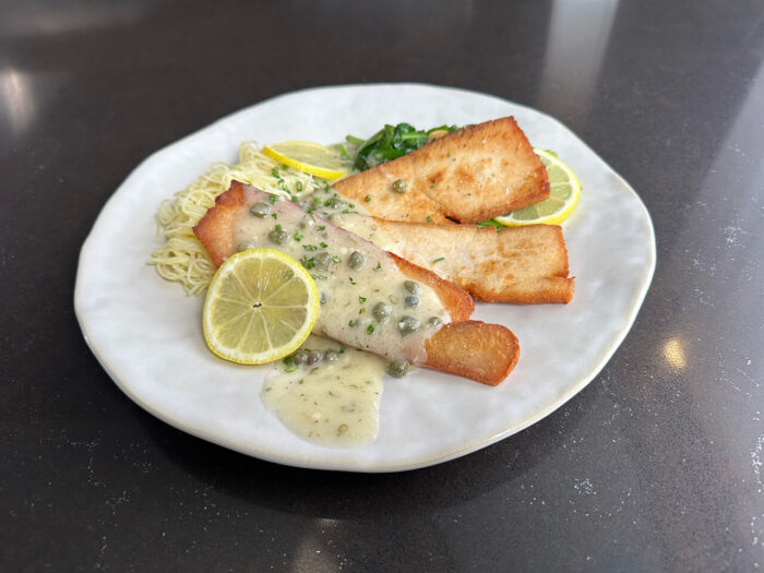 Slice and lightly pound turkey breast before dusting in flour and pan searing. Finish with a lemon-butter caper sauce and serve with angel hair pasta, garlic sautéed spinach, herbs and fresh lemon wedges.